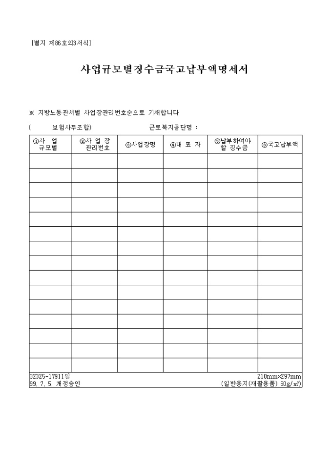9,000원/월사업규모별징수금국고납부액명세서[제86호의3서식] 양식입니다. 사업규모별, 사업장관리번호, 사업장명, 대표자, 납부하여 야할 징수금, 국고 납부액의 항목으로 구성된 명세서 양식입니다.