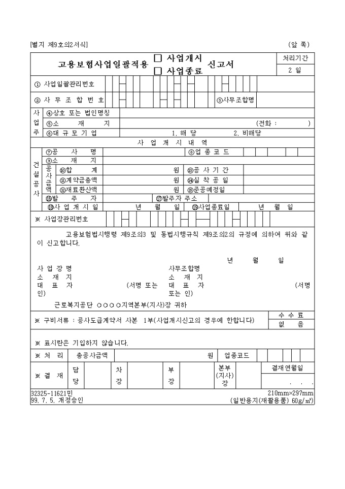 9,000원/월[별지 제9호의2서식] 고용보험법시행령 제9조의3 및 동법시행규칙 제9조의2의 규정에 의하여 사업일괄 적 사업개시(종료)를 신고할 때 사용하는 양식입니다.