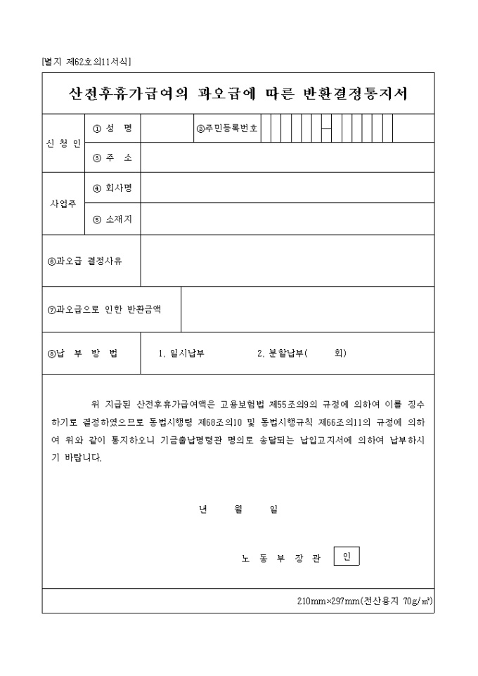 9,000원/월산전후휴가급여의 과오급에 따른 반환결정통지서[제62호의11서식] 양식입니다.