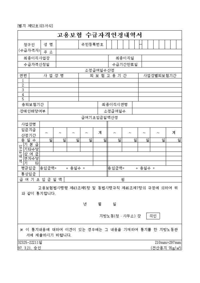 9,000원/월[별지 제52호의3서식] 고용보험법시행령 제43조제5항 및 동법시행규칙 제46조제7항의 규정에 의하여 수급자격의 인정내역을 통지할 때 사용하는 양식입니다.