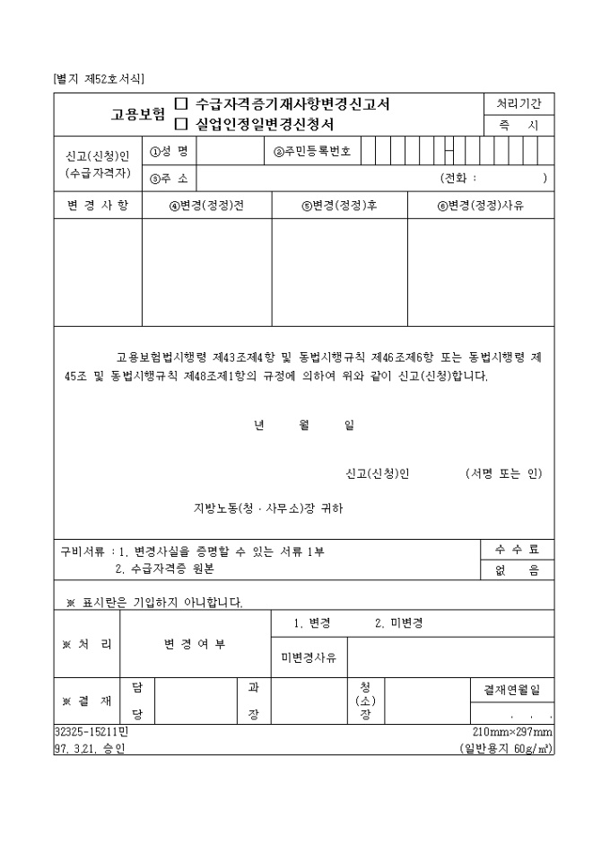 9,000원/월[별지 제52호서식] 고용보험법시행령 제43조제4항 및 동법시행규칙 제46조제6항 또는 동법시행령 제45조 및 동법시행규칙 제48조제1항의 규정에 의하여 수급자격증 기재사항을 변경신고할 때 사용하는 양식입니다.