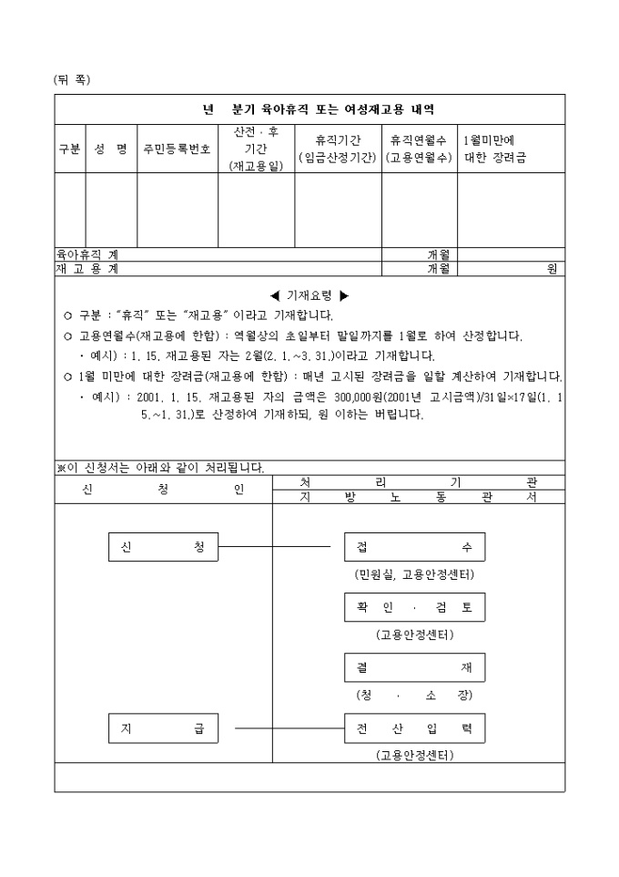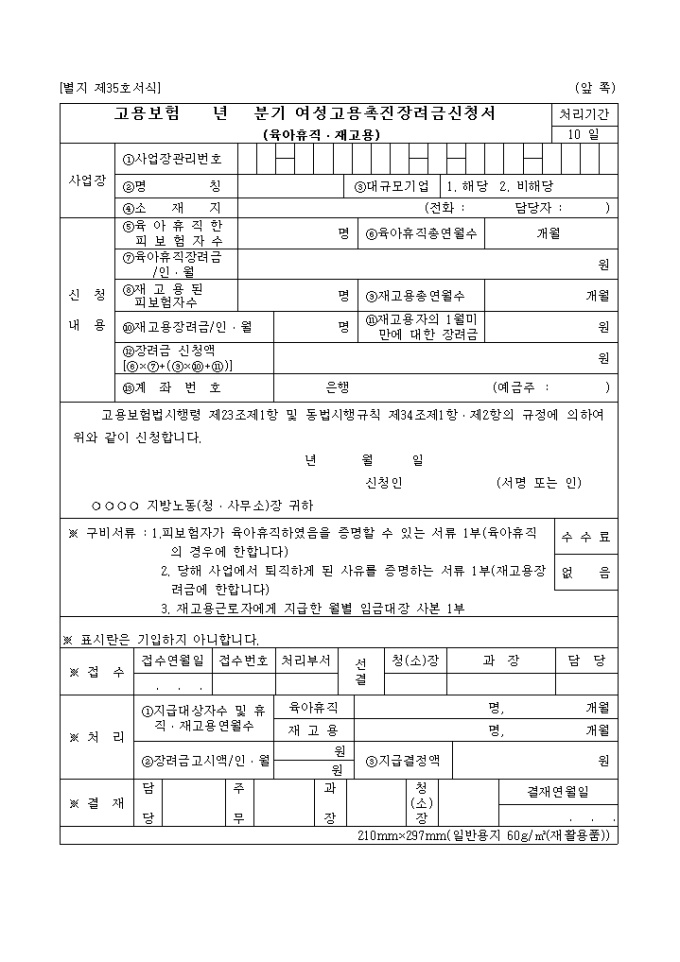 [별지 제35호서식] 고용보험법시행령 제23조제1항 및 동법시행규칙 제34조제1항·제2항의 규정에 의하여 여성고용촉진 장려금을 신청할 때 사용하는 양식입니다.