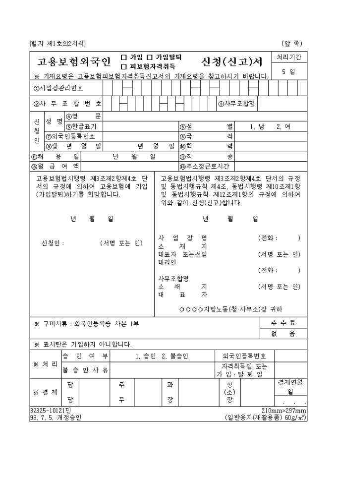 고용보험법시행령 제3조제2항제4호 단서의 규정 및 동법시행규칙 제4조, 동법시행령 제10조제1항 및 동법시행규칙 제12조제1항의 규정에 의하여 위와 같이 신청(신고)하실때 사용하는 양식입니다.