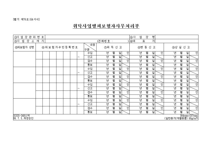 9,000원/월[별지 제76호의4서식] 사업장별 취득신고, 변동신고, 상실신고등 피보험자 사무처리를 기록하는 양식입니다.