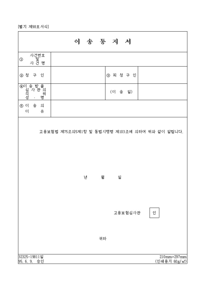 9,000원/월[별지 제98호서식] 고용보험법 제75조의5제1항 및 동법시행령 제103조에 의하여 이송을 통지할 때 사용하는 양식입니다.