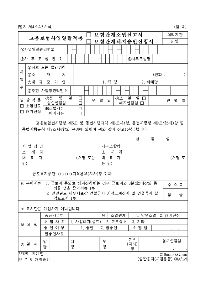 [별지 제4호의3서식] 고용보험법시행령 제5조 및 동법시행규칙 제6조제4항, 동법시행령 제9조의2제3항 및 동법시행규칙 제7조제4항의 규정에 의하여 일괄적용 보험 관계를 소멸 신고할 때 사용하는 양식입니다.