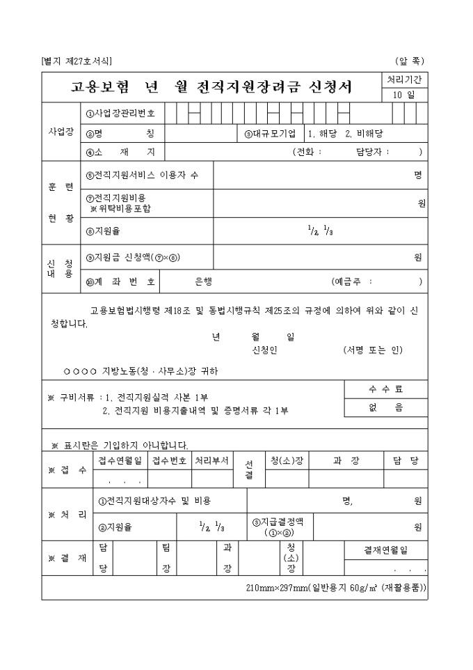 9,000원/월전직지원장려금신청서[제27호서식] 양식입니다. 고용보험법시행령 제18조 및 동법시행규칙 제25조의 규정에 의하여 위와 같이 신청하실때 사용하는 양식입니다.