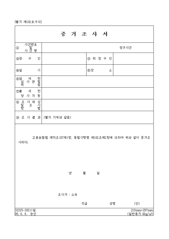 9,000원/월증거조사서[제102호서식] 양식입니다. 고용보험법 제75조의7제1항, 동법시행령 제102조제2항에 의하여 위와 같이 증거조사하실때 사용하는 양식입니다.