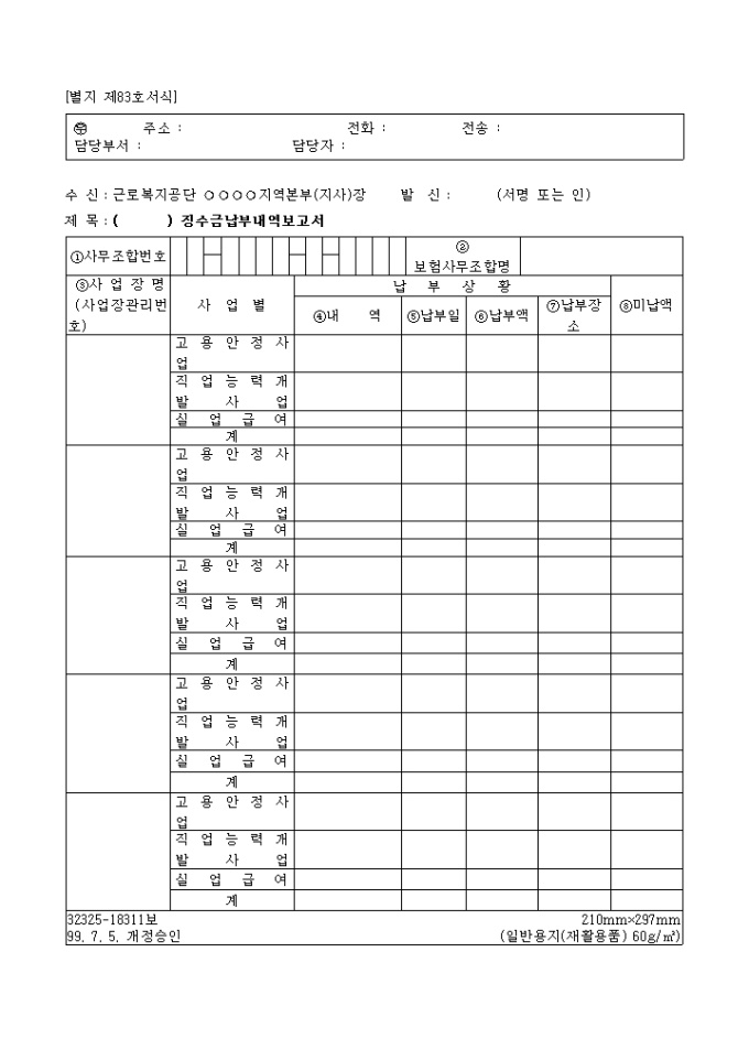 9,000원/월징수금납부내역보고서[제83호서식] 양식입니다. 사업장명,사업별,납부상황,미납액등의 항목으로 구성된 보고서 양식입니다.