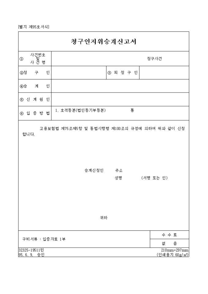 9,000원/월청구인지위승계신고서[제95호서식] 양식입니다. 고용보험법 제75조제5항 및 동법시행령 제100조의 규정에 의하여 위와 같이 신청하실때 사용하는 양식입니다.