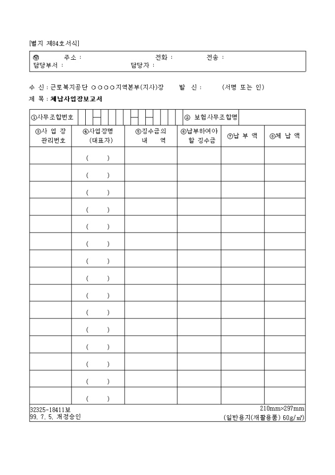 체납사업장보고서[제84호서식] 양식입니다. 사업장관리번호,사업장명,징수금의 내역,납부하여야할 징수금,납부액,체납액으로 구성된 양식입니다.