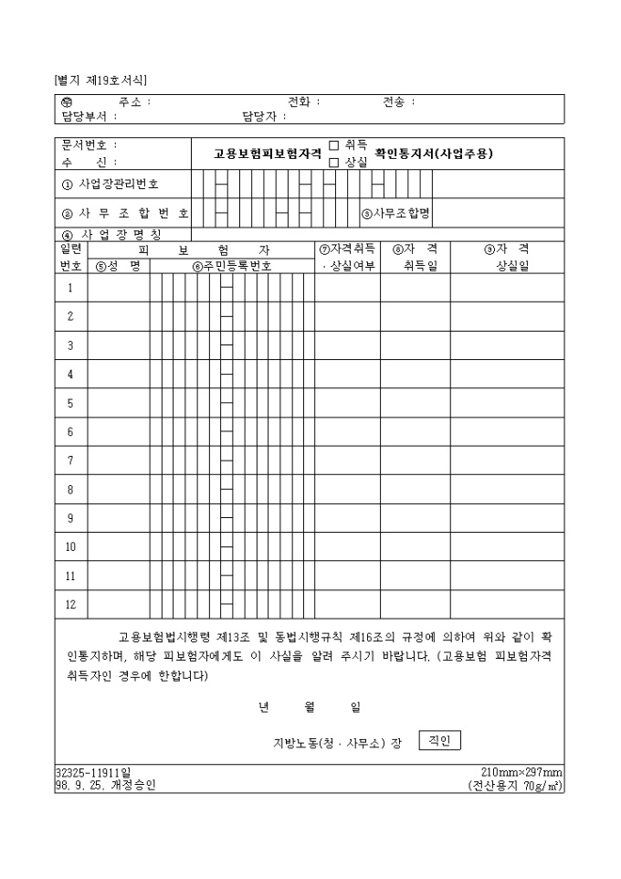9,000원/월취득(상실)확인통지서(사업주용)[제19호서식] 양식입니다. 고용보험법시행령 제13조 및 동법시행규칙 제16조의 규정에 의하여 위와 같이 확인통지하며, 해당 피보험자에게도 이 사실을 알려 주시기 바랍니다. (고용보험 피보험자격취득자인 경우에 한합니다) ... 위의 경우 취득(상실)등의 확인을 통지하실때 사용하는 양식입니다.