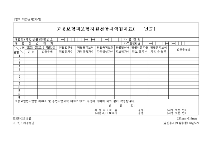 피보험자원천공제액집계표[제63호의2서식] 양식입니다. 고용보험법시행령 제70조 및 동법시행규칙 제68조의2의 규정에 의하여 위와 같이 작성하실때 사용하는 양식입니다.