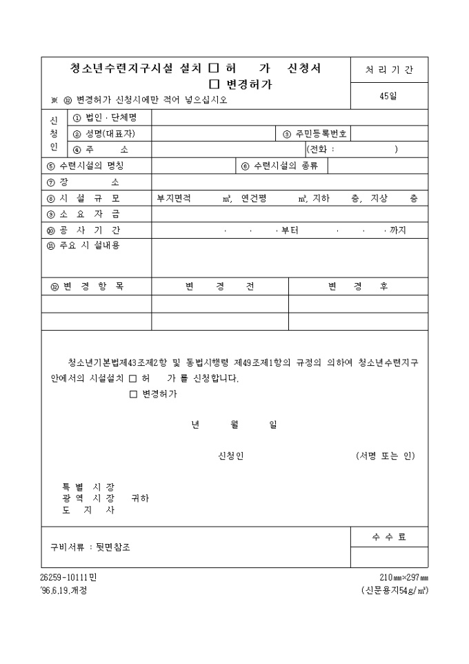 9,000원/월청소년기본법제43조제2항 및 동법시행령 제49조제1항의 규정의 의하여 청소년수련지구안에서의 시설설치 (허가, 변경허가)를 신청하고자 할 때 사용하는 "청소년 수련지구 시설 설치(허가,변경허가)신청서" 양식입니다.