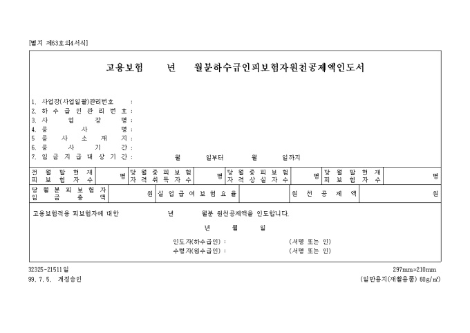 9,000원/월하수급인피보험자원천공제액인도서[제63호의4서식] 양식입니다. 고용보험적용 피보험자에 대한 년 월분 원천공제액을 인도하실때 사용하는 양식입니다.