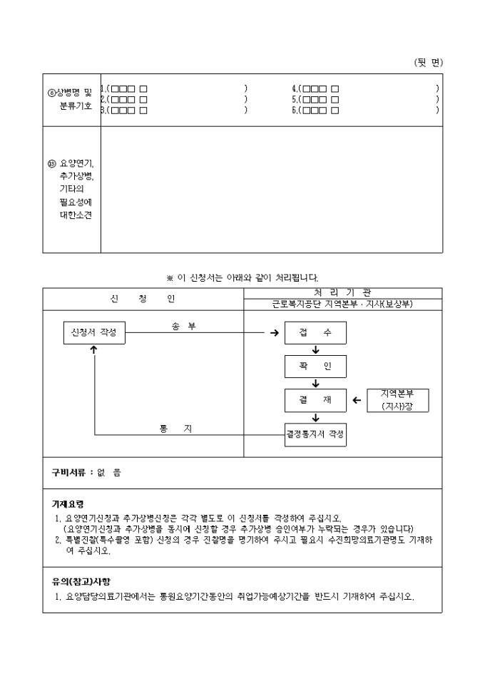 ※ 현재까지 치료내용, 향후 치료방법, 치료효과 및 적정한 치료예상기간 등 요양연기의 구체적 사유 및 내용을 기재하여 주십시오.
