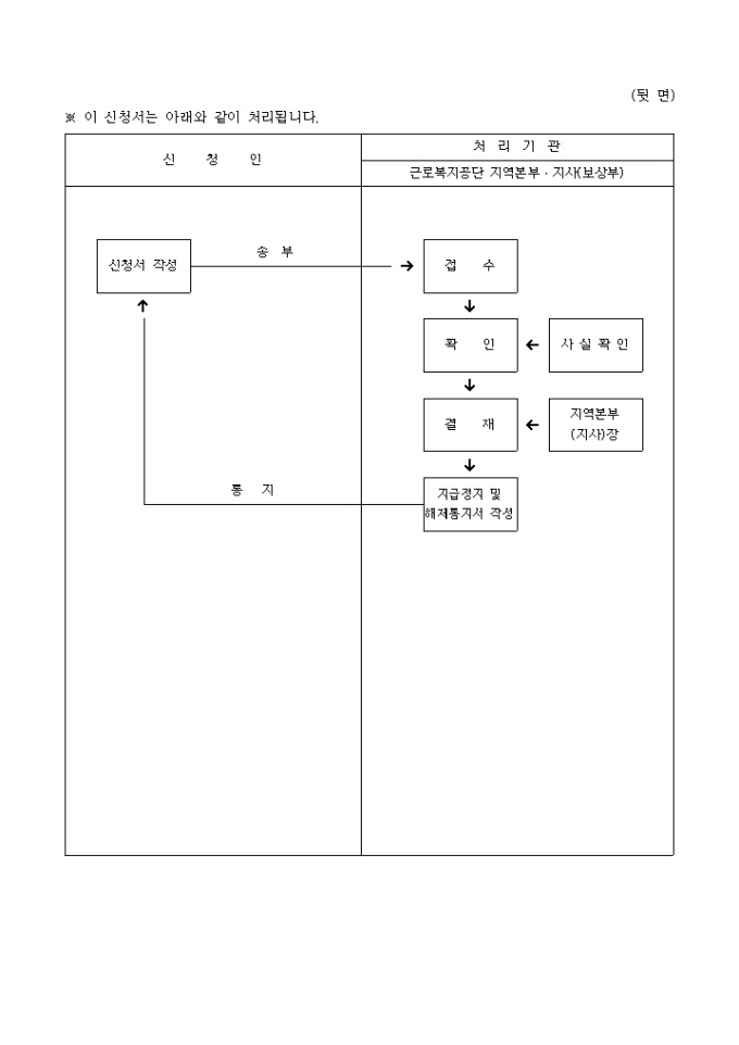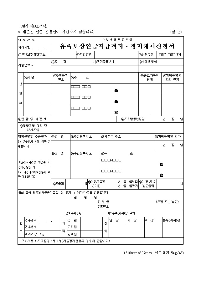 유족보상연금지급의 (□정지․□정지해제)를 신청하실때 사용하는 양식입니다.
