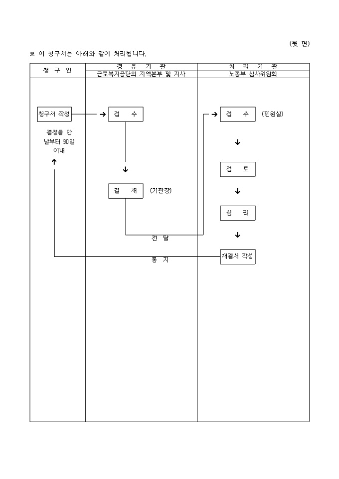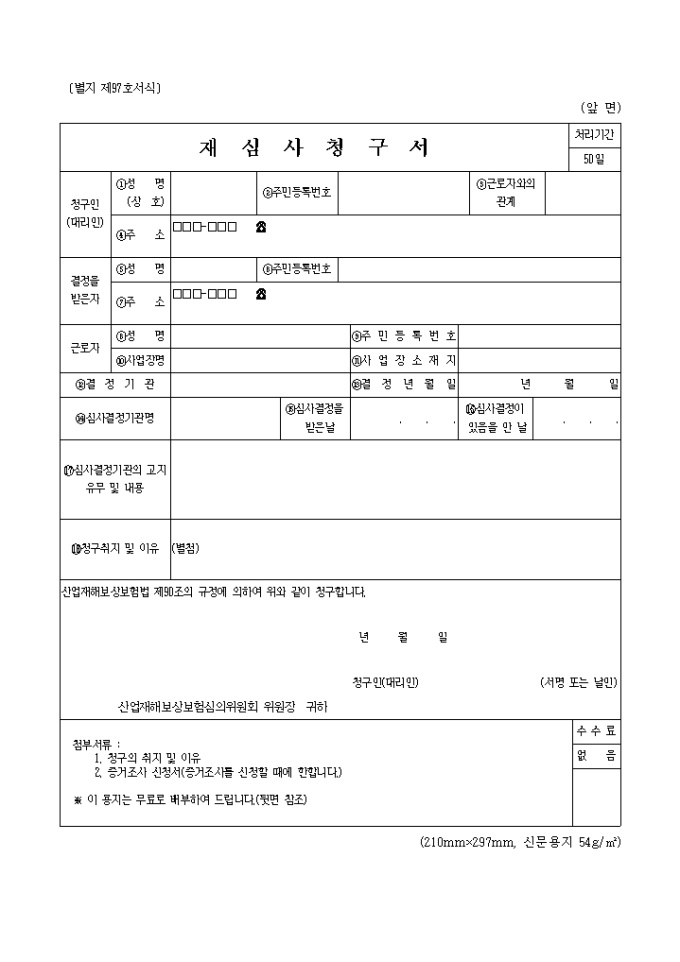 9,000원/월재심사 청구서[별지 제97호서식] 양식입니다. 산업재해보상보험법 제90조의 규정에 의하여 위와 같이 청구하실때 사용하시는 양식입니다.