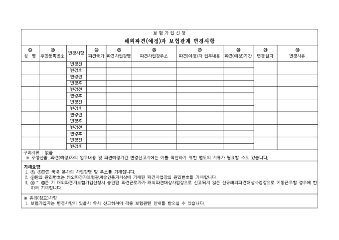9,000원/월보험가입신청 해외파견자보험관계변경사항신고서[별지 제104호서식]1 양식입니다. ※ 유의(참고)사항 1. 보험가입자는 변경사항이 있을시 즉시 신고하셔야 각종 보험관련 안내를 받으실 수 있습니다.