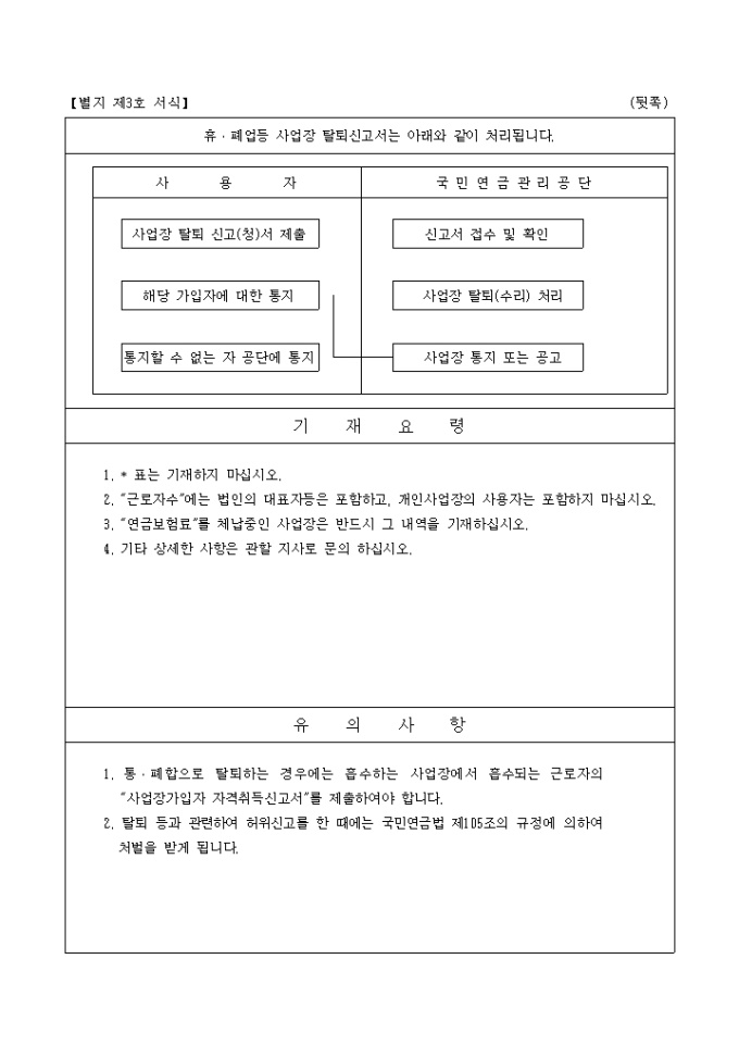 위와 같이 휴․폐업 또는 통․폐합 등 사업장 탈퇴신고 할때 사용하는 양식입니다.