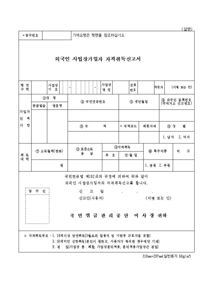 9,000원/월외국인 사업장가입자 자격취득신고서 양식입니다. 국민연금법 제102조의 규정에 의하여 위와 같이 외국인 사업장가입자의 자격취득신고를 하실때 사용하는 양식입니다.