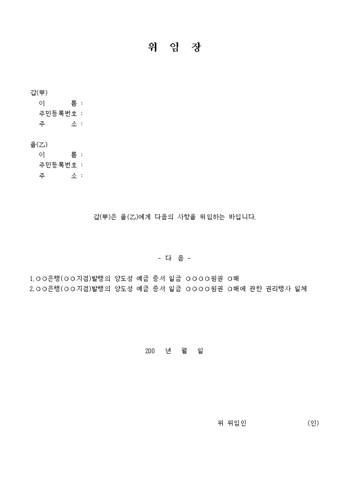 를 위임하는 양도성 예금 중서에 관한 일체 행위에 대한 권리를 위임하는 위임장 양식입니다.