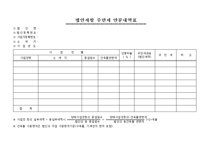 9,000원/월법인세할 주민세 안분내역표 양식 예제입니다.