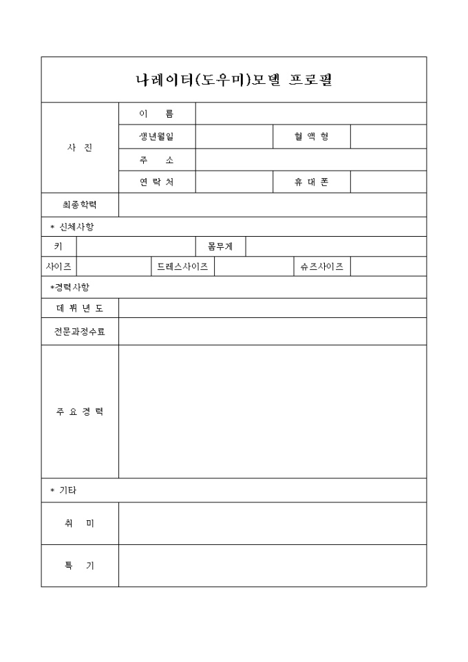 나레이터 모델이나 도우미 프로필을 작성시 사용하는 양식입니다. 사진을 부착할 수 있고 신체사항, 경력등의 다양한 내용을 기재할 수 있도록 되어 있습니다.