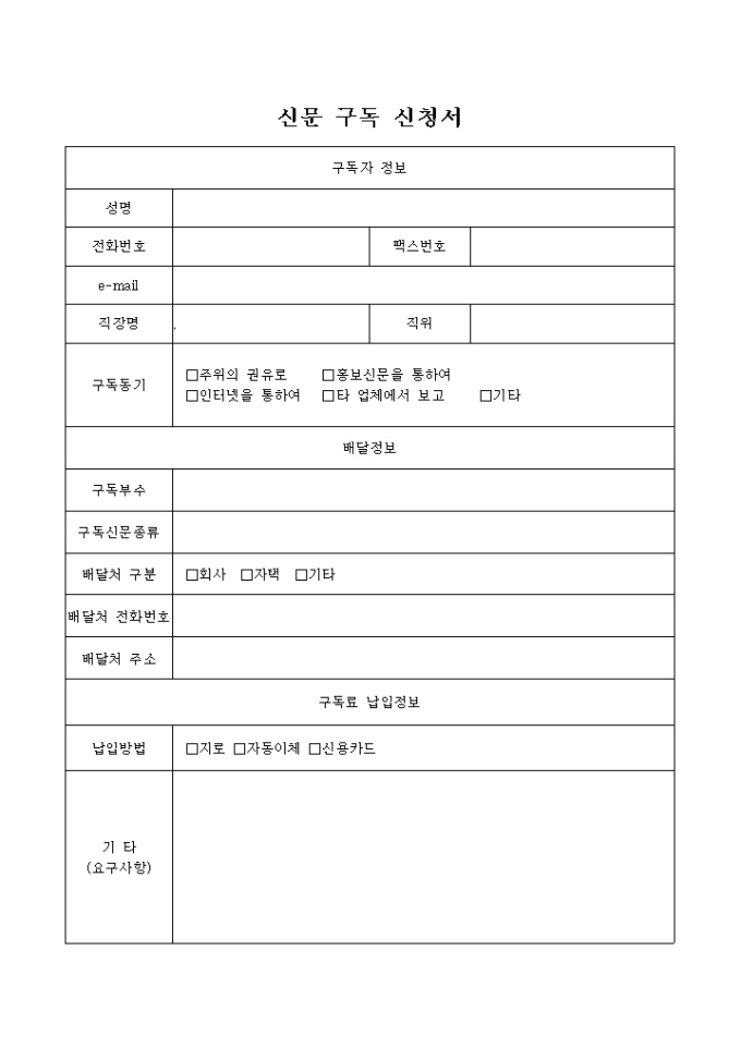 신문을 구독하기 위해 작성하는 신청서 양식입니다.