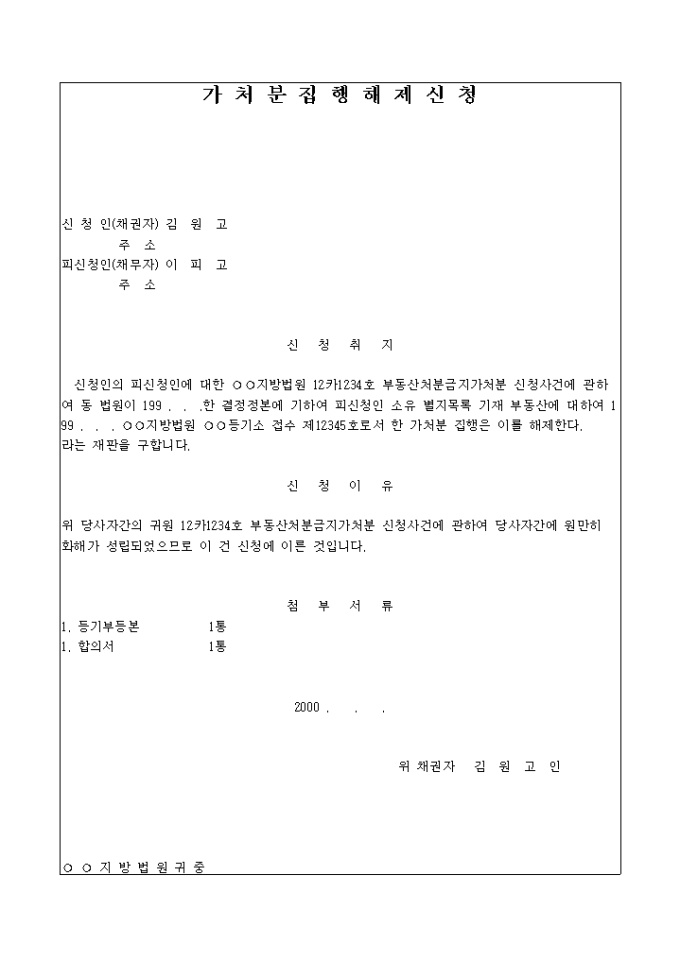9,000원/월가처분 집행 해제 신청서로 신청취지,신청이유가 기재되어 있어 예제로 참고하시면 되겠네요..