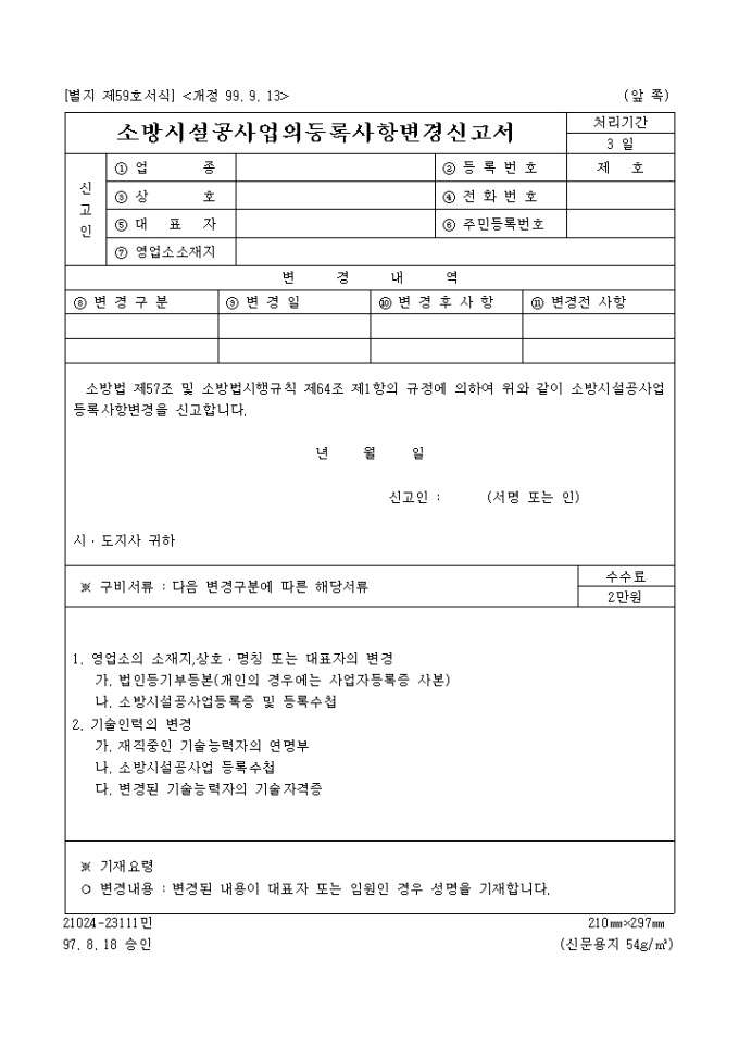 소방법 제57조 및 소방법시행규칙 제64조 제1항의 규정에 의하여 위와 같이 소방시설공사업등록사항변경을 신고하고자 할 때 사용하는 서식입니다.