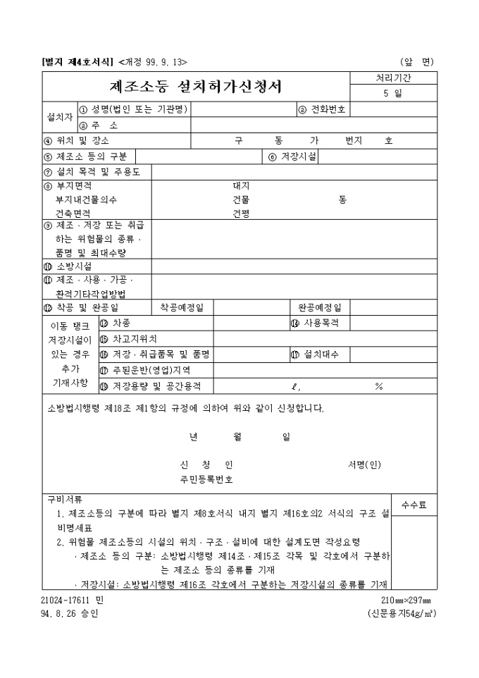 소방법시행령 제18조 제1항의 규정에 의하여 위와 같이 제조소등의 설치허가 신청을 하고자 할 때 사용하는 서식입니다.