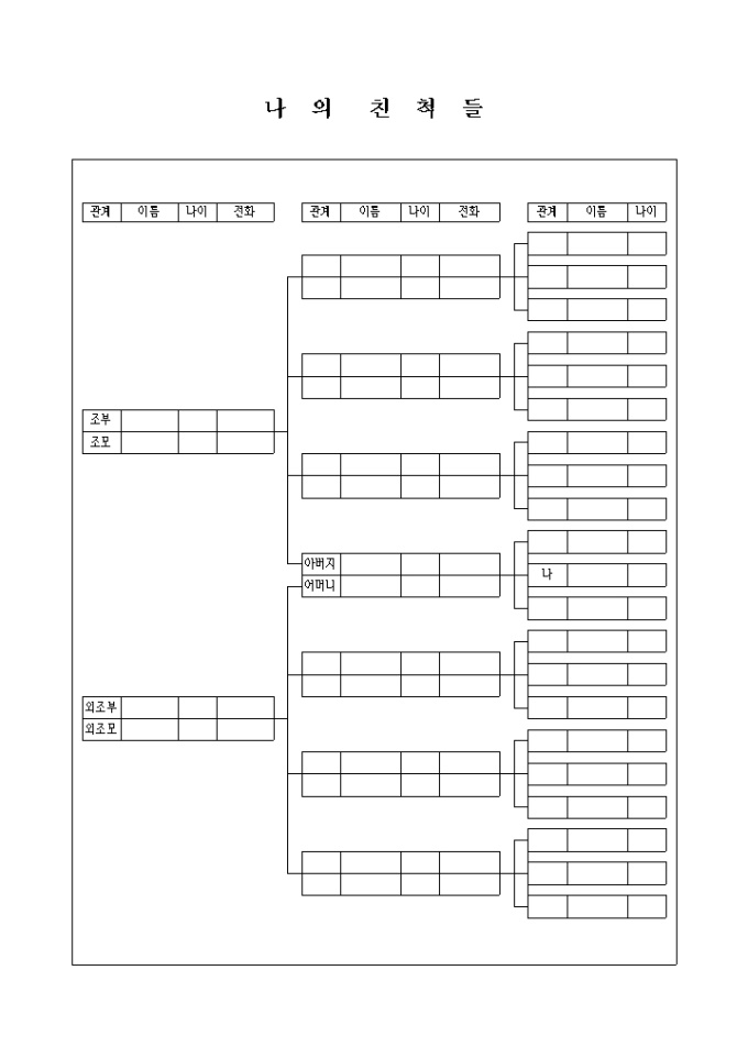 나의 친척들을 도식적 구조로 기록하여 알 수 있도록 정리가능한 양식입니다.