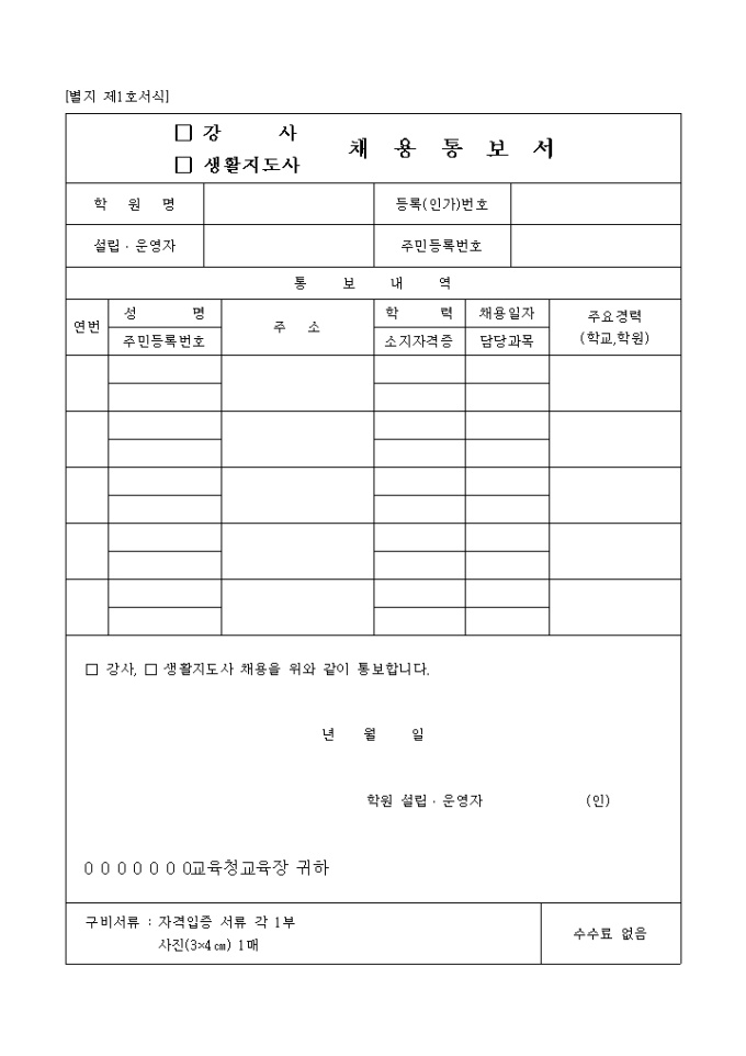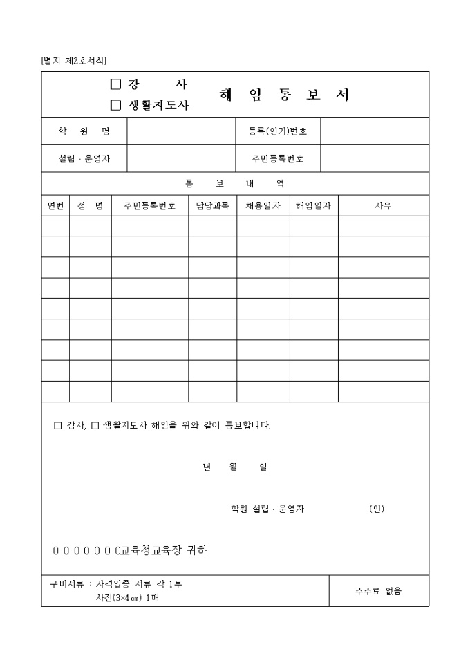 학원설립자가 강사, 생활지도사 채용 및 해임을 해당 교육청에 통보할 때 사용하는 서식입니다.