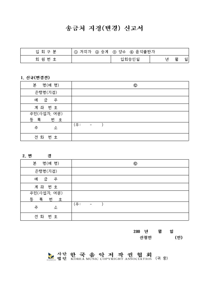 9,000원/월한국음악권 저작권 협회 송금처 지정(변경) 신고서 양식입니다. 구성 1. 신규(변경전) 2. 변경