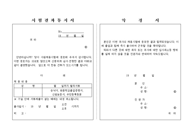 입사지원 시험결과 통지서 및 약정서 양식 입니다.
