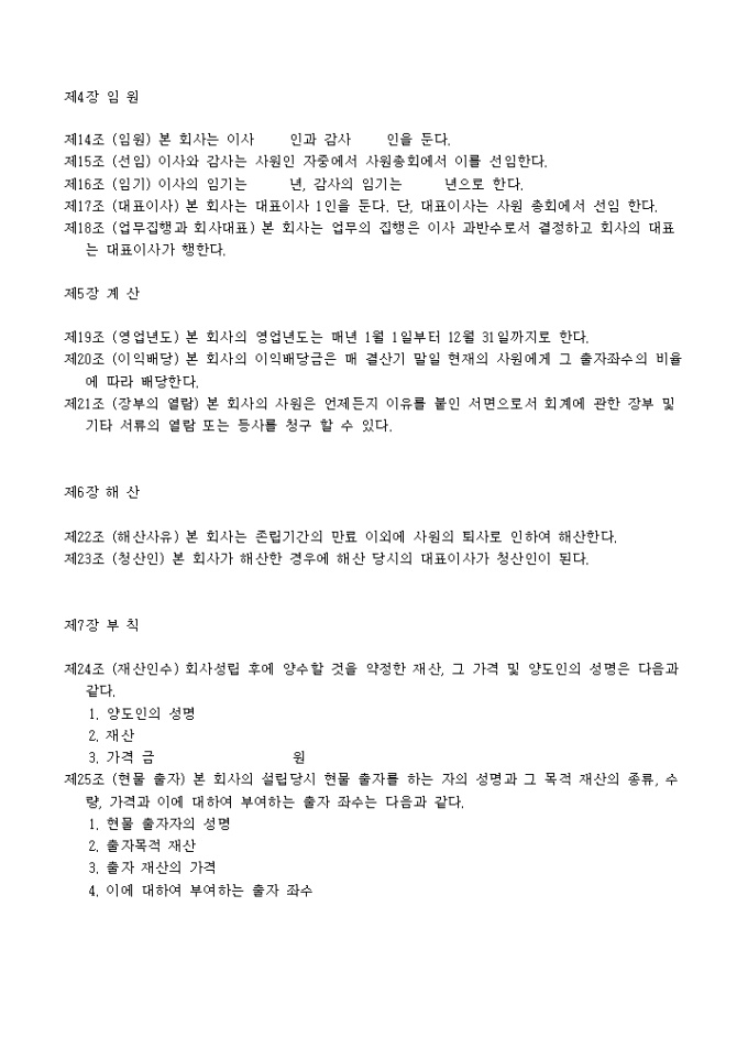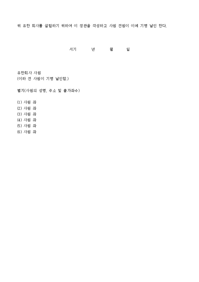 다음과 같은 항목으로 되어 있는 유한회사 정관입니다. 1.상호 2.목적 3.본점과 지점 4.자본의 총액 5.존립기간 1.출자의 좌수 및 1좌의 금액 2.사원의 성명,주소 및 출자좌수 등..