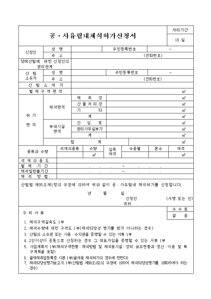 9,000원/월산림법 제95조제1항의 규정에 의하여 위와 같이 공․사유림내 채석허가를 신청할 때 사용하는 "공,사유림내 채석 허가신청서" 양식입니다.