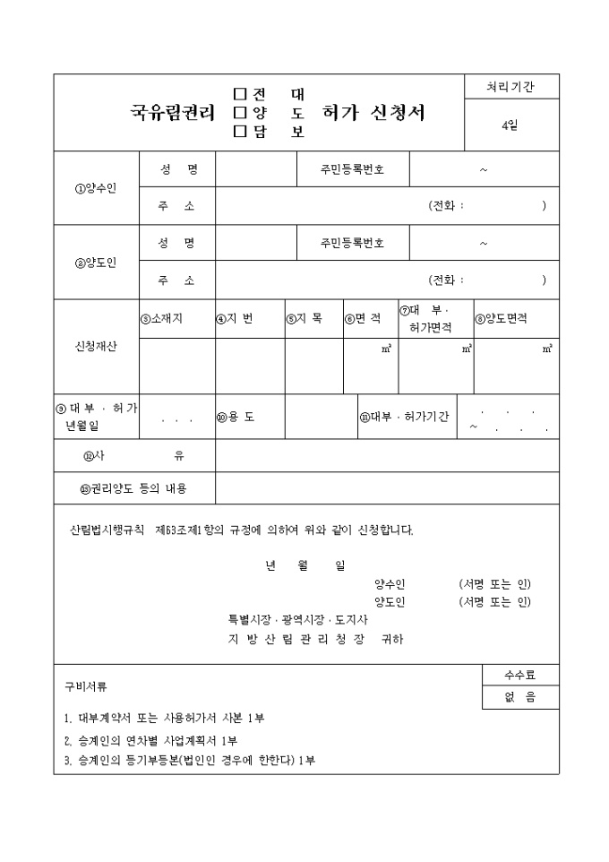 9,000원/월산림법시행규칙 제63조제1항의 규정에 의하여 위와 같이 신청할 때 사용하는 "국유림 관리 (전대,양도,담보제공) 허가신청서" 양식입니다.