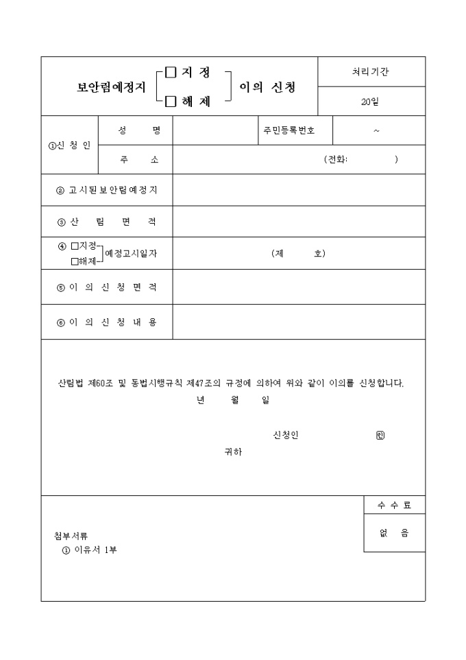산림법 제60조 및 동법시행규칙 제47조의 규정에 의하여 위와 같이 이의를 신청할 때 사용하는 "보안림 예정지(지정,해제)이의신청" 양식입니다.