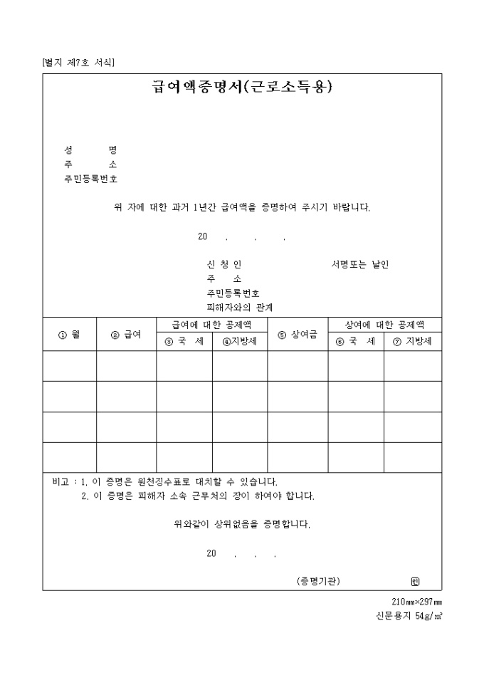 9,000원/월과거 1년간 급여액을 증명을 얻고자 할 때 사용하는 급여액증명서(근로소득용) 양식입니다.