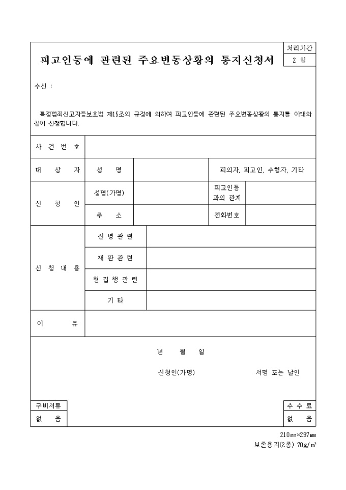 특정범죄신고자등보호법 제15조의 규정에 의하여 피고인등에 관련된 주요변동상황의 통지를 아래와 같이 신청시에 사용하는 "피고인등에관련된주요변동상황의통지신청서" 양식입니다.