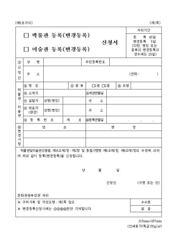 박물관및미술관진흥법 제16조제1항•제2항 및 동법시행령 제8조제1항, 제9조제1항의 규정에 의하여 위와 같이 등록(변경등록)을 신청하고자 할 때 사용하는 "(박물관,미술관)(등록,변경등록)신청서" 서식입니다.