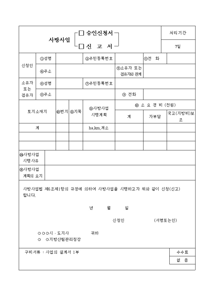 사방사업법 제6조제1항의 규정에 의하여 사방사업을 시행하고자 위와 같이 신청(신고)하고자 할 때 사용하는 "사방사업(승인신청서,신고서)" 양식입니다.