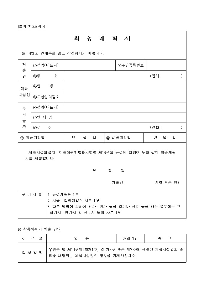 9,000원/월체육시설의설치․이용에관한법률시행령 제16조의 규정에 의하여 위와 같이 착공계획서를 제출할 때 사용하는 "착공계획서" 양식입니다.