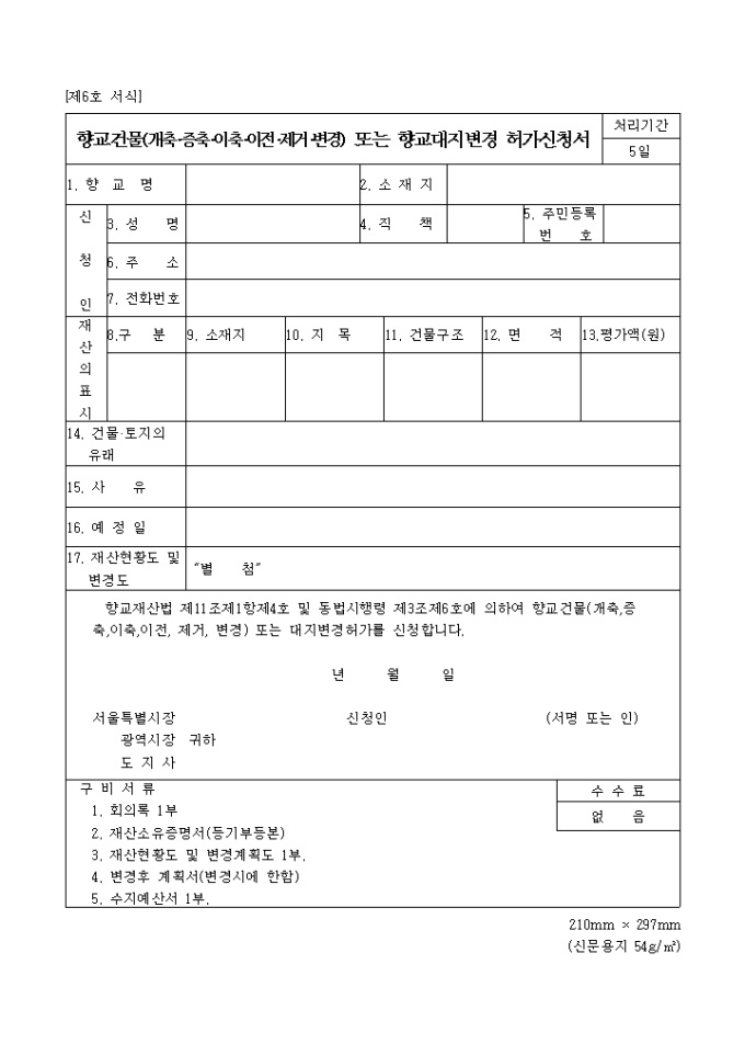 9,000원/월향교재산법 제11조제1항제4호 및 동법시행령 제3조제6호에 의하여 향교건물(개축,증축,이축,이전, 제거, 변경) 또는 대지변경허가를 신청할 때 사용하는 "향교건물(개축,증축,이축,이전,제거,변경) 또는 향교대지 변경 허가신청서" 양식입니다.