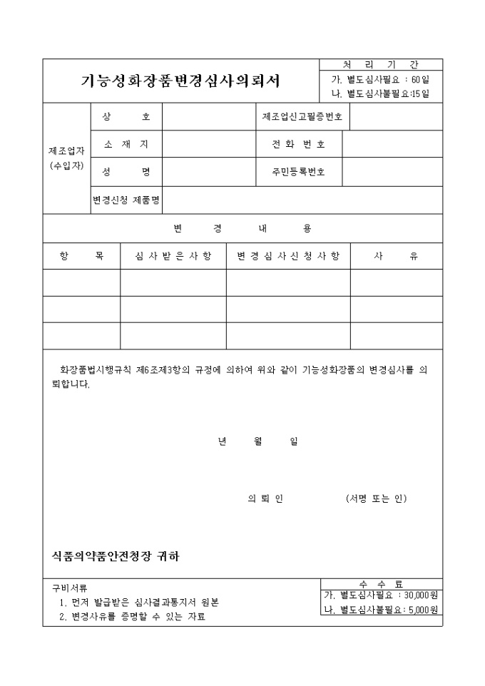 9,000원/월화장품법시행규칙 제6조제3항의 규정에 의하여 위와 같이 기능성화장품의 변경심사를 의뢰할 때 사용하는 "기능성화장품 변경심사의뢰서" 양식입니다.