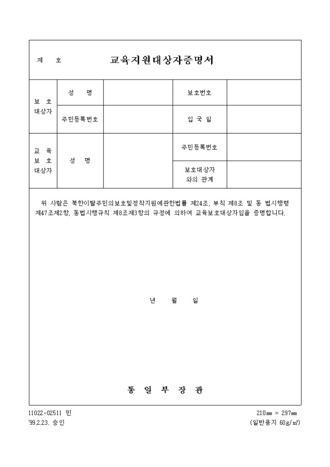 북한이탈주민의보호 및 정착지원에 관한 법률 제24조, 부칙 제8조 및 동 법시행령 제47조제2항, 동법시행규칙 제8조제3항의 규정에 의하여 교육보호대상자임을 증명하는 사용하는 교육지원 대상자 증명서 양식입니다.