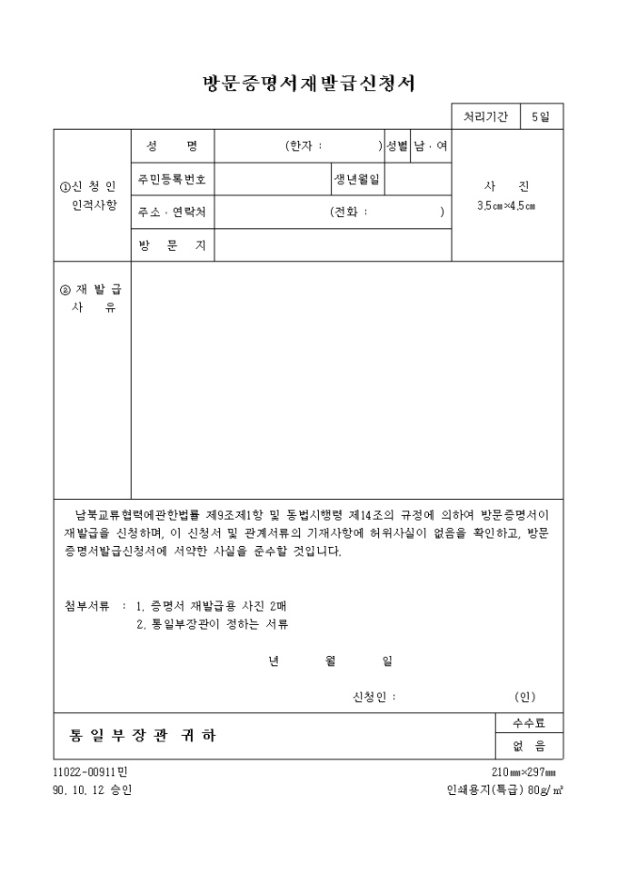9,000원/월방문증명서재발급신청서 양식 예제입니다. .... 남북교류협력에 관한 법률 제9조제1항 및 동법시행령 제14조의 규정에 의하여 방문증명서이 재발급을 신청하며, 이 신청서 및 관계서류의 기재사항에 허위사실이 없음을 확인하고, 방문증명서발급신청서에 서약한 사실을 준수할 것을 선서합니다. ....