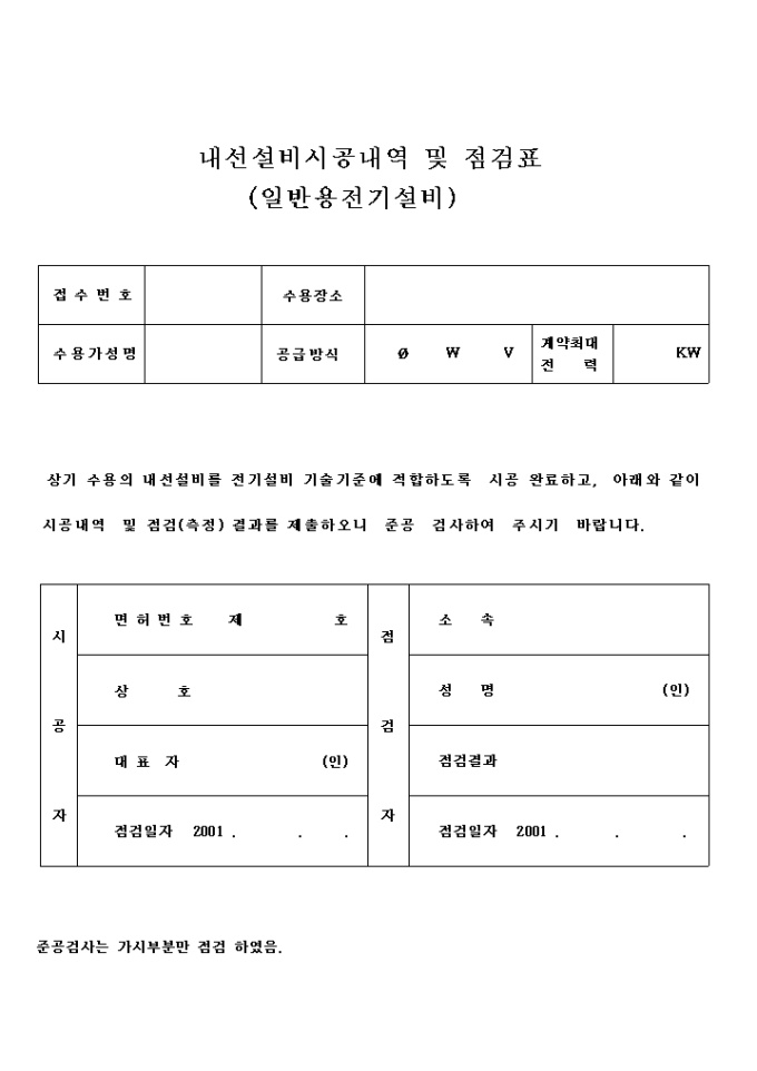 9,000원/월한국 전력에서 사용하는 내선 설비 시공 내역 및 점검표(일반용전기)입니다. 상기 수용의 내선설비를 전기설비 기술기준에 적합하도록 시공 완료하고, 아래와 같이 시공내역 및 점검(측정) 결과를 제출하오니 준공 검사하여 주시기 바랍니다.